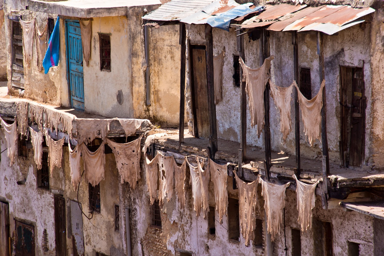 In the center of the medina in Fes, the hides of sheep, goats, cows, and camels undergo several processes, including the removal of hair and flesh, followed by soaking in vats, then drying and rinsing, before they are ready to be dyed and then handed over to leatherworkers. We were given a sprig of mint to ward off the powerful, unpleasant odors emanating from the vats. Pigeon droppings used in the process contribute to the stench. We had a guide, a woman who had lived in the medina all her life, to get us to the tanneries. Otherwise we would never have found it.